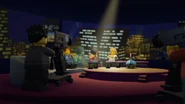 Im Hintergrund war der Konzertsaal auf einer Leinwand in einer Talkshow, zu der Jay, Cole, and Nya geladen waren, hinter den Gästen zu sehen, die Ninjago City bei Nacht zeigte.